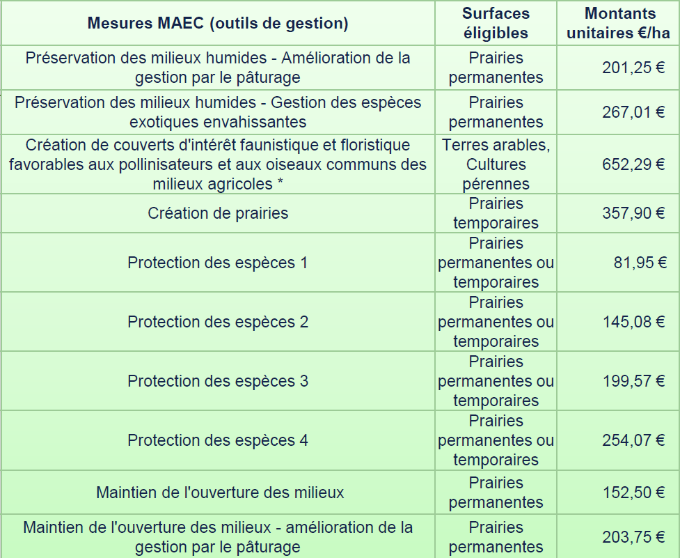 Il y a en tout 10 mesures à retrouver dans le tableau ci-dessous, ainsi que la surface qui doit être déclaré à la PAC et le montant de la mesures à l'hectare. Pour chaque mesure, il y a un cahier des charges qui vous permettra de voir toutes les conditions pour y être éligible.